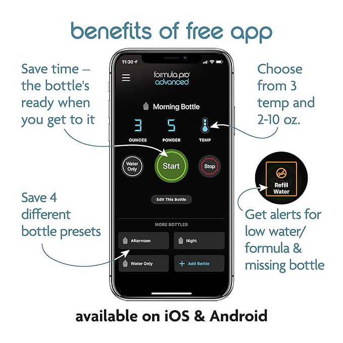 • MOST ADVANCED WAY TO AUTOMATICALLY MAKE A WARM, FORMULA BOTTLE IN SECONDS FROM YOUR PHONE: Press start on the app and the bottle will be ready when you get to your kitchen - No measuring, no mixing, no fuss