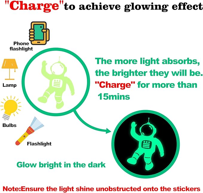 • Glow Brighter and Longer:Our moon and star decals are beautiful,very realistic and glow like crazy,they glow brighter and longer than the typical glow in the dark stickers,the brightness depends on the light it absorbs.you just need to put them under sunlight,room light or flashlight for 15 mins.Note:Please ensure the light shines unobstructed onto the moon.If you stick our stars for ceiling,please charge them with flashlight or room light before night