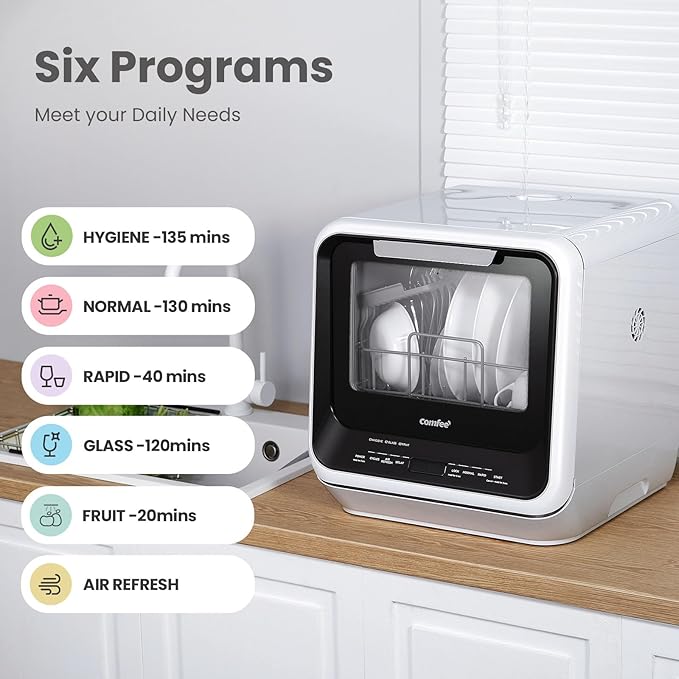 COMFEE' Portable Mini Dishwasher Countertop with 5L Built-in Water Tank for Apartments& RVs, No Hookup Needed, 6 Programs, 360° Dual Spray, 162℉ High-Temp& Air-Dry Function