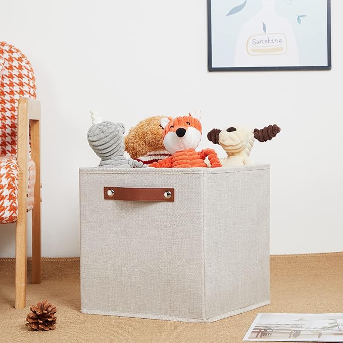 • 【Premium Material】The fabric used in the 11 inch fabric storage cubes bins baskets for shelves is fashionable and breathable, sturdy, breathable fabric materials with no peculiar smell, and the cardboard inside is strong and easy to fold. These cloth storage bins for cube organizer are sturdy enough to hold your stuff well. The leather handle is durable and easy to carry