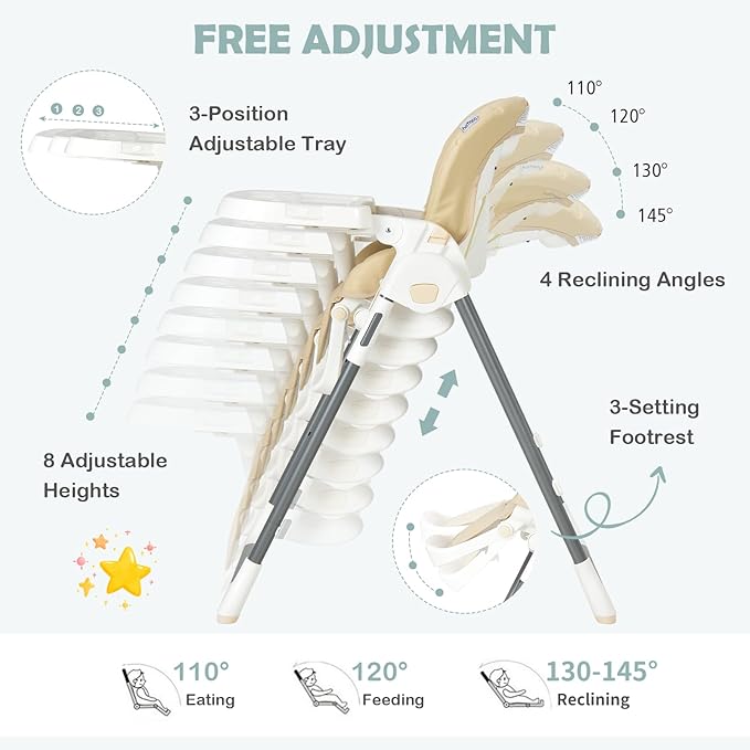 • Accompany the Growth of Baby: This baby high chair comes with 8 adjustable heights and 3-position adjustable food tray to match tables at different heights and grow up with your baby. The backrest with 4 reclining angles is ideal for different uses. Besides, the 3-setting footrest is designed to meet the baby's various postures.