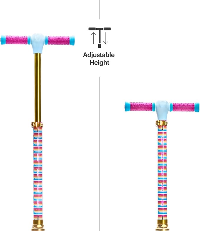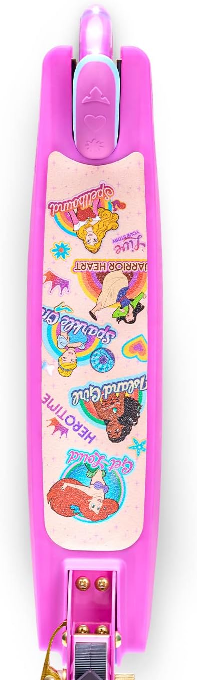 • DISNEY PRINCESS SCOOTERS: The deck features all of your favorite princesses while the stem is a stylish pink and blue showing off the Disney castle. This 2 wheel scooter comes with sparkling light up LED wheels and adjustable height handlebars.