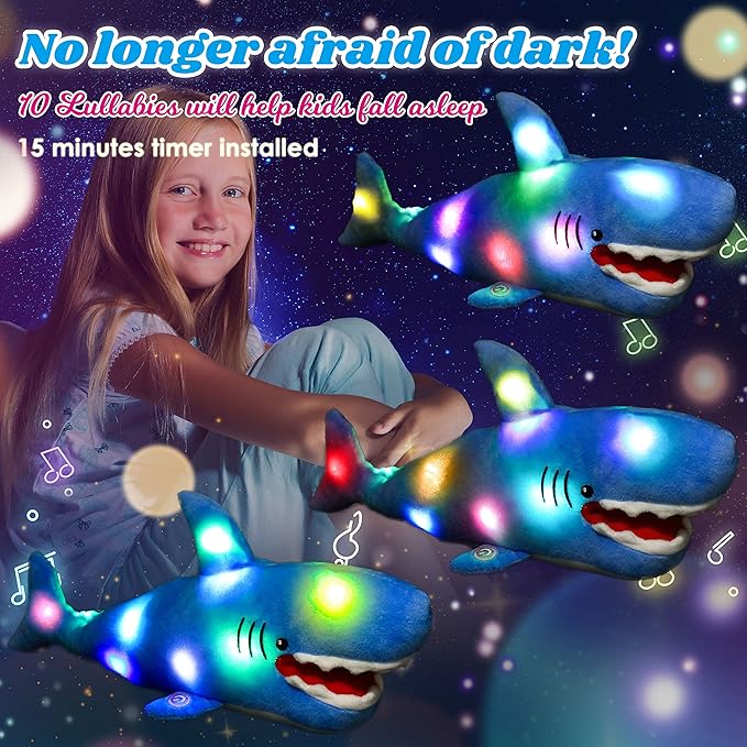 • GLOWING AND MUSICAL FUNCTION: This plush shark has the ability to glow in the dark and sing lullabies. In addition, we've installed a 15-minute timer inside so that if you don't touch the switch within 15 minutes, it will automatically turn off. However, you can still turn it off by pressing the switch again. You can find more detailed instructions on our product leaflet.
