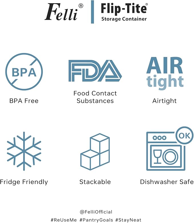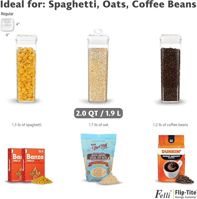 • AVAILABLE IN VARIOUS SIZES & SHAPES: The Felli Flip-Tite container comes in a variety of sizes and shapes to meet different food storage needs. The 4" REGULAR and RECTANGULAR sizes are perfect for organizing small kitchen counters and pantries, making handling and pouring easy. The 5" LARGE size is ideal for storing items like sugar and beans that need scooping. The 6" XL size is specifically designed for storing large quantities of food such as rice, powder, and flour, which require measuring spoons. We offer a versatile storage solution to suit all your needs.