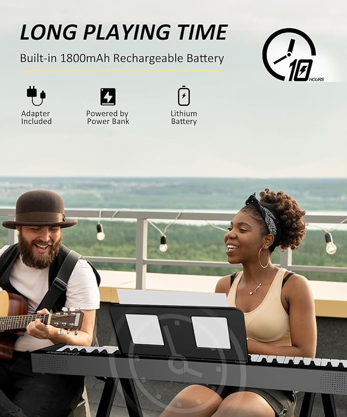 • 【Chargeable Portable Piano】The keyboard piano for beginners has a built in rechargeable Lithium battery, supporting USB charging, power bank charging, lithium battery-powered, 8-10h playtime after full charge. So you can paly it anywhwew anytime.
