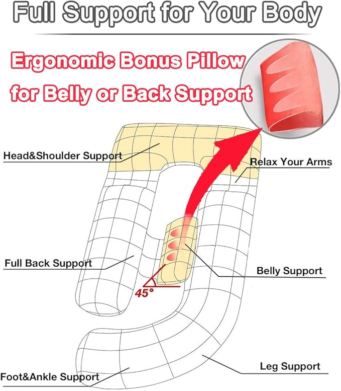 • Adults of all ages and sizes will benefit from our cozy pregnancy body pillow designed to embrace your total body while sleeping on your side, back or stomach