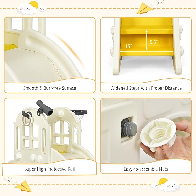 • 【6 In 1 Multi-purpose Sports Center】 BABY JOY large climber and slide playset is designed with 6 activity zones, including a long sloping slide, climber, tunnel, basketball hoop, ring toss and telescope, which make the slide set a paradise for children. What's more, the included small basketball and 3 PCS ring toss are convenient for kids to play. It can be used indoors and outdoors and is the best gift for children.