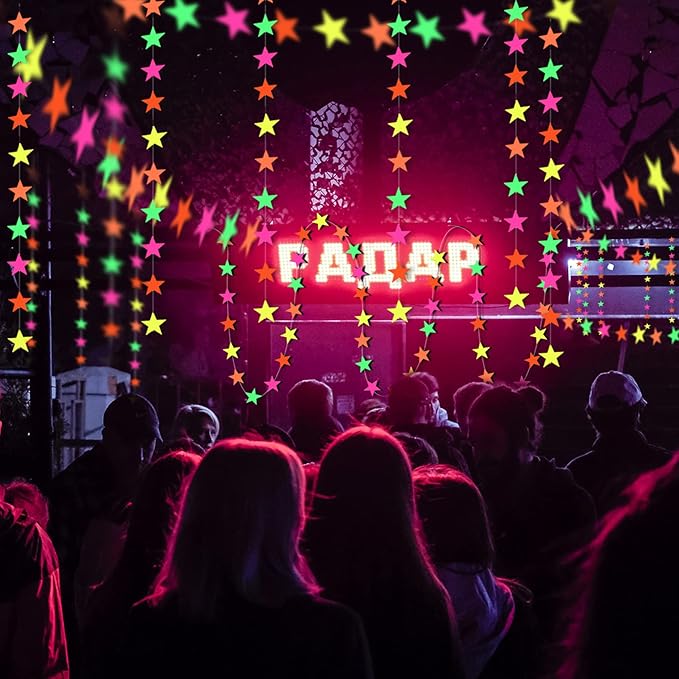 • 【Reliable Material】 These star neon streamers are made of High Quality Neon paper, which is Durable and touch smooth on the surface, lightweight reusable and long-lasting. The UV reactive garland is Ideal Neon Party Supplies and glow in the dark accessories, Bring the Party to a More Visible and Bright Scene.