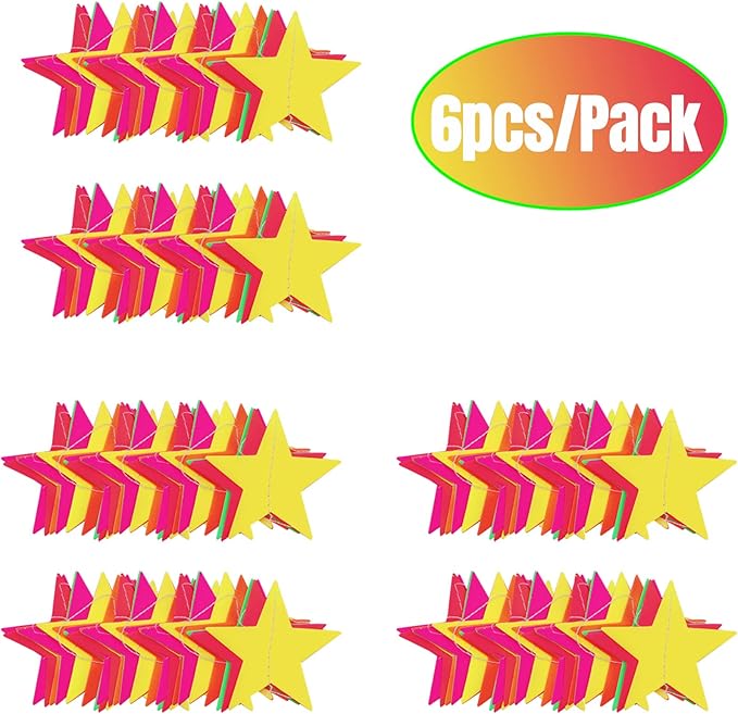 • 【What you can GET】Package Includes: 6 packs of 18 feet long fluorescent star paper garland, each have 40 Stars, diameter about 2.67inch. These Star Garland Combined with 5 colors, that is pink, orange, green, yellow, and red. which will certainly be a huge hit at any neon theme or glow party