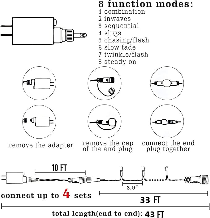 • 8 Lighting Modes Christmas Lights: 8 Modes (combination, in wave, sequential, slo-glo, chasing/flash, slow fade, twinkle/flash, and steady on). You could use different modes of the 100 LED lights according to different occasions, light up a unique outdoor & indoor illuminated backdrop for your vivid and funny decorations.