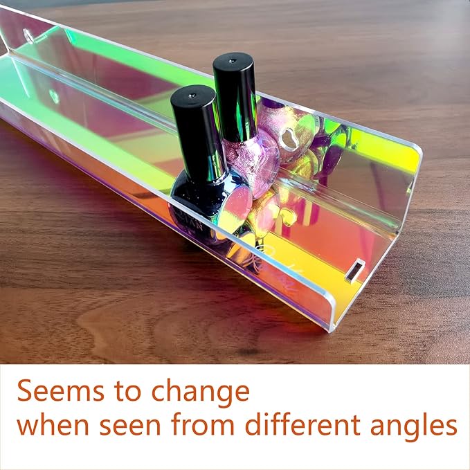 • Iridescent acrylic shelves changes color when viewed from different angles and is a great alternative to boring clear acrylic to add beautiful color to your studio or room.