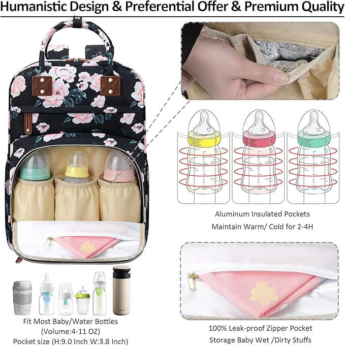 Diaper Bag Backpack Tote for Women Large Capacity with Insulated Pockets Multifunctional Diaper Bags For Baby Girl Boy Waterproof Baby Bags, Maternity Bag Black Pink Floral
