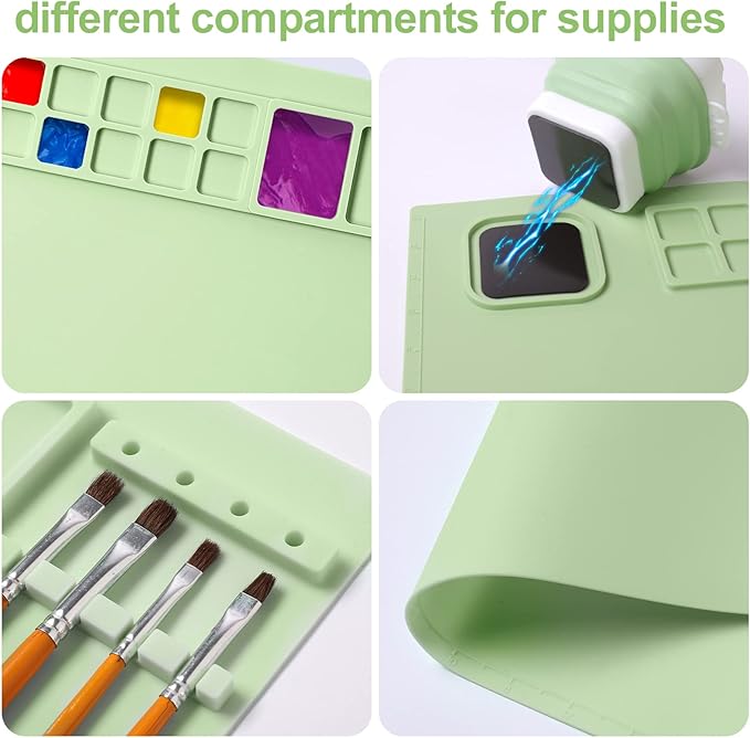 • [LARGE SILICONE MAT]: The size of the silicone artist mat with a water cup is 20×16 inches. The slightly raised edge keeps everything on the art mat.