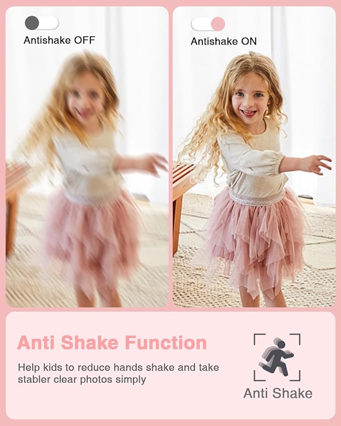 • MEANINGFUL GIFT - This pink digital camera for kids is equipped with a high-level CMOS Sensor and anti-shake function, which helps to capture vivid clear 44MP Images and record stable smooth FHD 1080P resolution videos. It's a meaningful Christmas or birthday gift camera for kids to cultivate their interest in photography, experience the lovely life, and leave funny memorable moments with family or friends.
