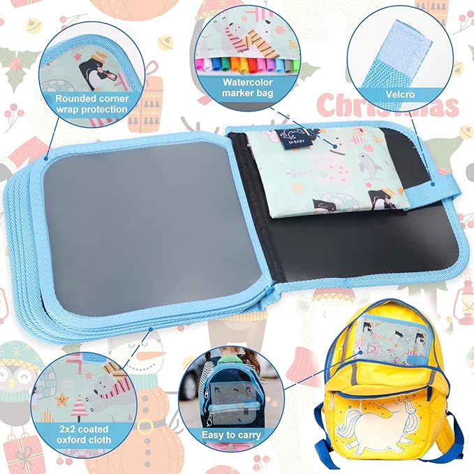 • 🎨Kid's Road Trip Essentials--Kids Erasable Graffiti Book has sticky buttons on the outside to keep it in place and a pens pocket on the inside for 12 watercolor pens. Even in cars, planes and other means of transportation, kids can draw as much as they want.