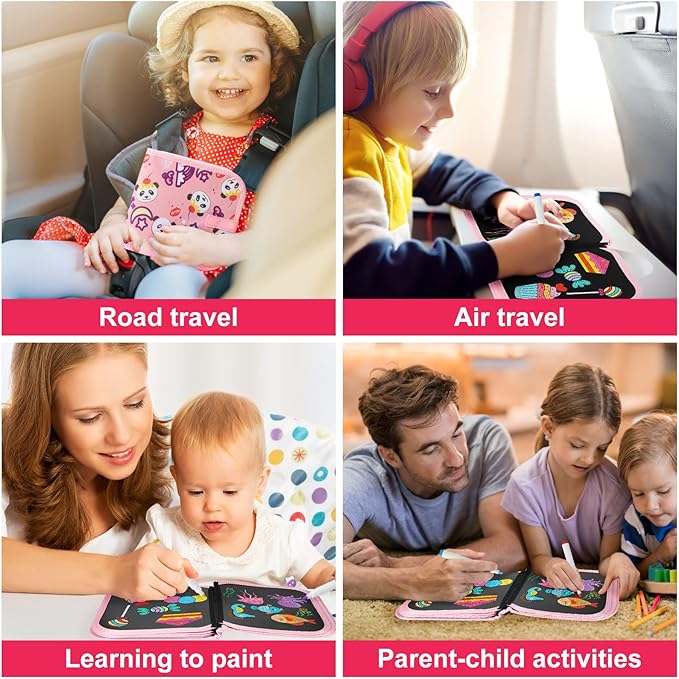 • 🎨Kid's Road Trip Essentials--Kids Erasable Graffiti Book has sticky buttons on the outside to keep it in place and a pens pocket on the inside for 12 watercolor pens. Even in cars, planes and other means of transportation, kids can draw as much as they want.