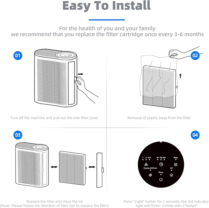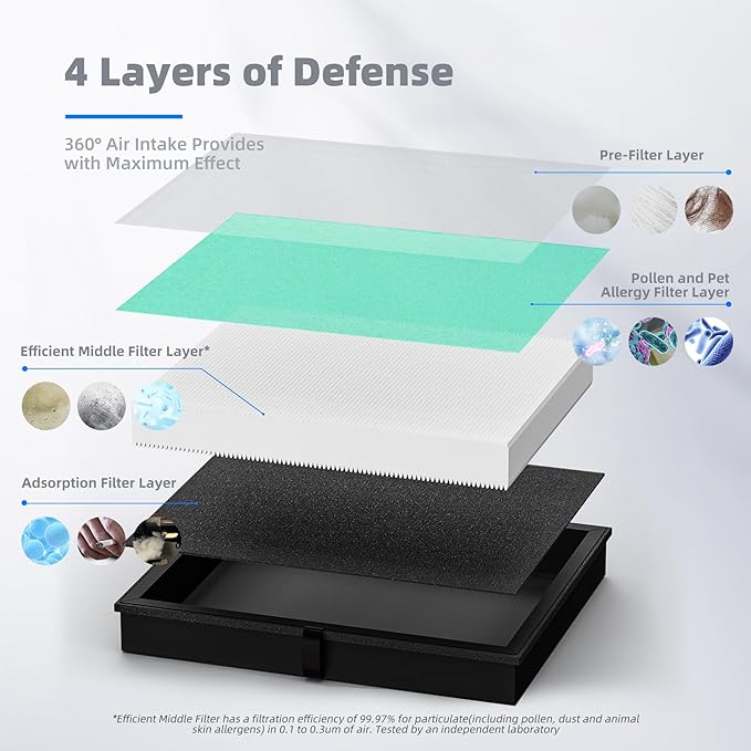 • Prevent Clogging: When hairs, dander, and other large particles meet the pre-filter layer, they will be blocked outside to prevent the air purifier from clogging.