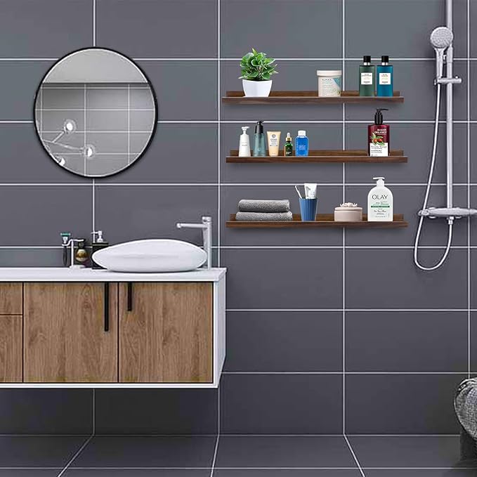AZSKY 24 Inch Floating Shelves Rustic Wood Wall Shelf Deep Dark Walnut Floating Shelves a Set of 3 Hanging Narrow Picture Photo Ledge Shelves Wall Mounted Bathroom Bedroom Kitchen Office Décor