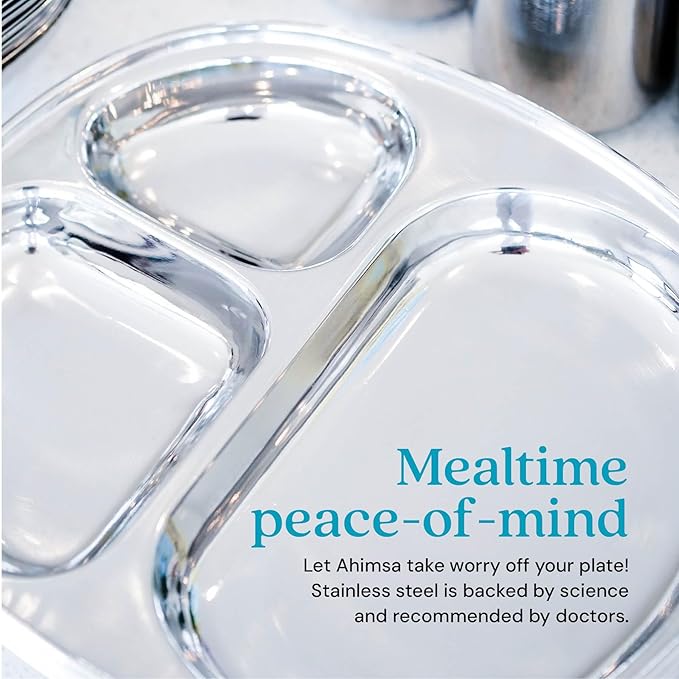 • Kid Approved — Ahimsa Mindful Mealtime Sets make mealtime fun with vibrant and colorful stainless steel kids plates that children adore. Included is a stainless steel toddler plate with dividers, a 8 oz. kids stainless steel cup and small baby bowl, and kids silverware (1 kid fork, 1 kid spoon).