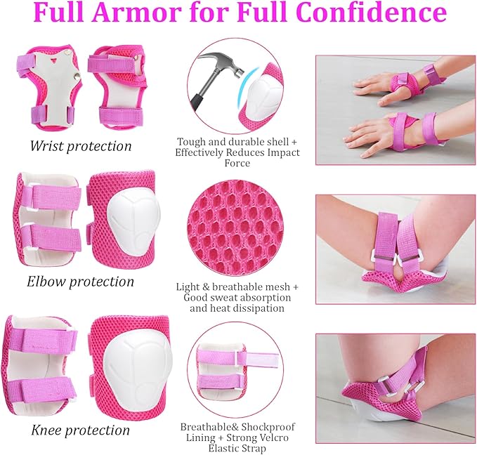 • 【7 pcs Kids Helmet Protective Gear】- Including 1 bike helmet, 2 x Elbow Pads, 2 x Knee Pads, 2 x Wrist Pads. Consist of anti-scratch extra hard ABS shell for hard protection, and adjustable straps ensure the protective gear will not shift. Provides your kids comfortable and safe, A great gift for toddler and kids age 3-8 years old