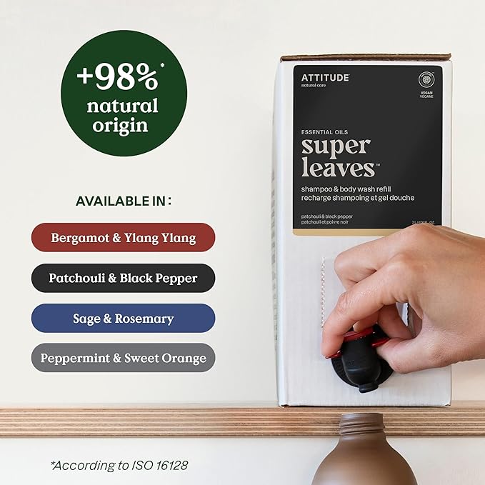 ATTITUDE 2-in-1 Body Wash and Hair Shampoo, EWG Verified Shower Gel, Dermatologically Tested, Made with Naturally Derived Ingredients, Vegan Personal Care, Patchouli and Black Pepper, 67.6 Fl Oz