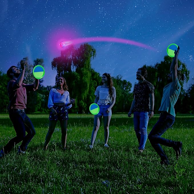 • Upgraded Kids Outdoor Toys - Our toss and catch game set includes two thicken waterproof enlarged paddles, a regular waterproof ball and an unique light-up ball with flashing lights which is perfect for playing in the yard at night