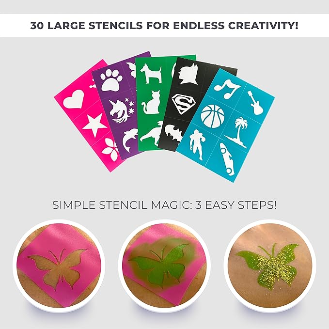 • Discover Ultimate Fun: Dive into the world of creativity with Zenovika's face painting kit, boasting 26 vivid colors, 2 metallic shades, 4 neon glow in the black light, 30 reusable stencils, 3 brushes, 2 glitter powders, 2 sponges and an instructional face paint book with 39 designs
