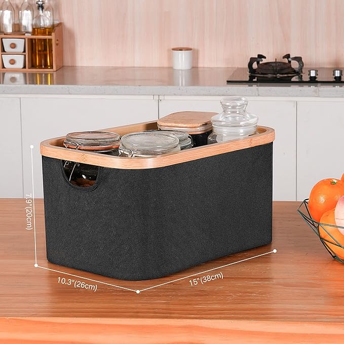 efluky Storage Baskets for Organizing, Fabric Storage Bins with Bamboo Handles, Collapsible Storage Baskets for Shelves and Closet, Black Set of 2