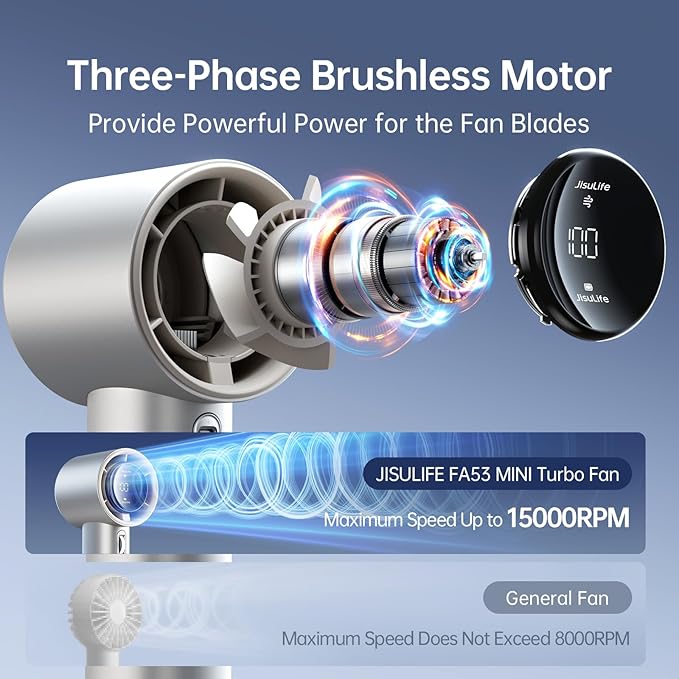 • Brushless Motor - Super Power: The combination of a three-phase brushless motor and a 5000mAh battery significantly improves the wind speed, power, and endurance. The maximum wind speed can reach 9m/s. The highest rotation speed of the handheld fan is three times that of a regular personal fan, reaching up to 15000 RPM. It can cool for 3-15 hours on a single charge