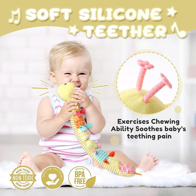 • Sensory Learning Toys - The body part of the baby caterpillar toy has 3 different sensory designs - crinkle, rattle and bell. Each has a different texture and sound. Baby's eyes and hands will focus on these design as they explore. It helps baby develop fine motor skills and auditory development.