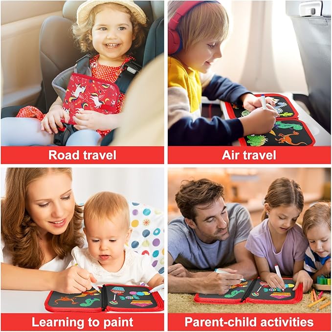 • 🎨Kid's Road Trip Essentials--Kids Erasable Graffiti Book has sticky buttons on the outside to keep it in place and a pens pocket on the inside for 12 watercolor pens. Even in cars, planes and other means of transportation, kids can draw as much as they want.
