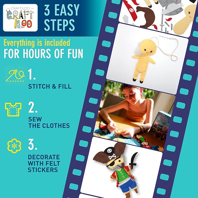 CRAFTILOO Pirates Pre-Cut Fun Kids Sewing Kit for Kids Ages 8-12 Children Beginners Sewing kit Kid Crafts Make Your Own Felt Pillow Plush Craft Kit Girls and Boys Art Craft Kits Learn to Sew Kit