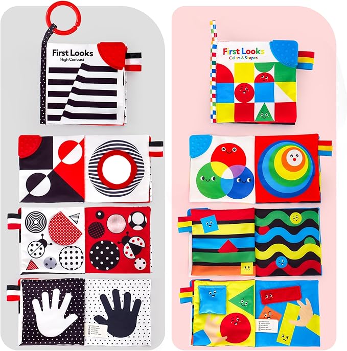 • Baby Books 2pcs for Infants - Ignite your little one's visual development with our 2pcs baby books set, featuring high-contrast black/ white/red patterns(book I), progressing to basic colors with shapes and emotion patterns(book II). It provides excellent visual stimulation, supportingbrain development from the very start