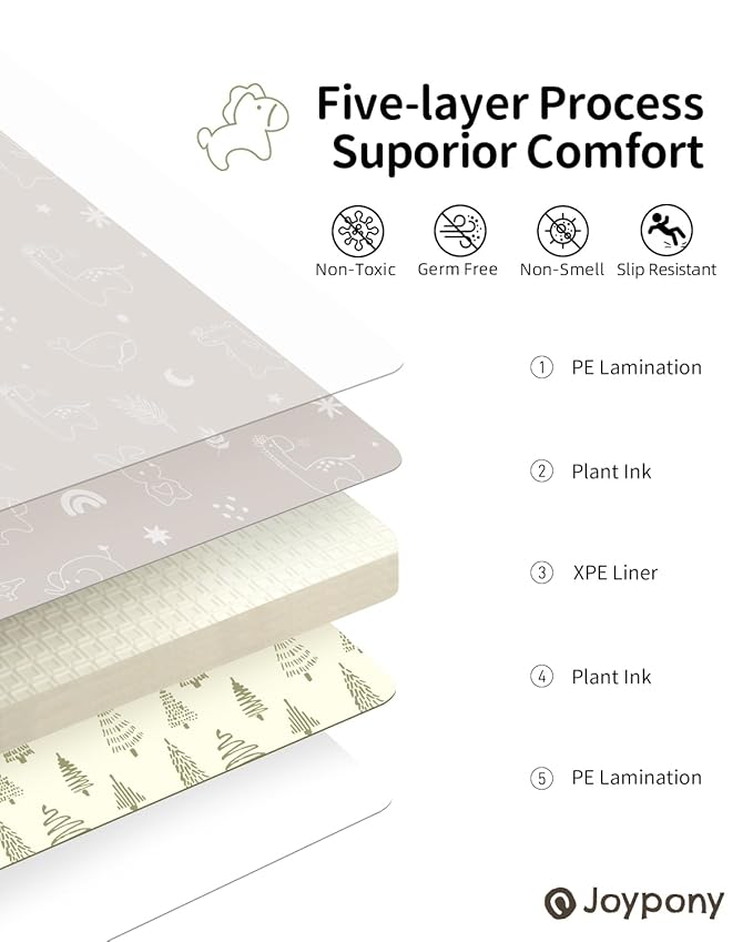 • [SAFETY & COMFORT - FOREMOST PROMISE] - Made from high-density XPE foam material, our baby play mat is BPA-free, non-toxic, and no chemical smell, ensuring a soft and safe play surface for infants and toddlers. Its cushioned design is perfect for protecting little ones from hard floors and providing extra support during tummy time. Joypony play mat is truly reliable, safe and and is ready to use right out of the box.