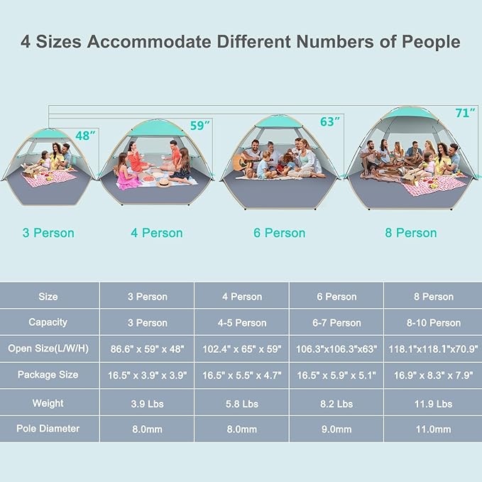 • Super Large Space: Size of 118"L x 118"W x 71"H, 30% bigger than other instant tents at a similar price, fits 8-10 people. It provides a comfortable space for family and friends on the beach