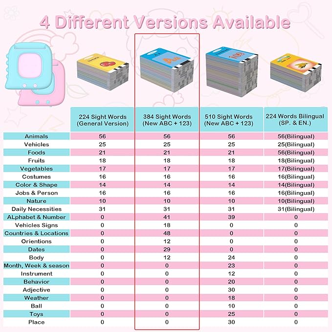 • 【Upgrade version & More cards】: Nibour 384 sight words talking flash cards is an updated version with added new 8 themes such as letters, numbers, dates, vehicles, etc. More content can stimulate toddler imagination, enhance their cognitive abilities.
