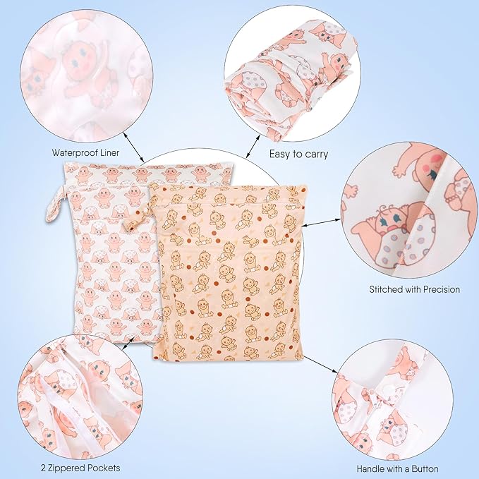 • 2 ZIPPERED POCKETS & HANDLE DESIGN: The 2 pack laundry bags are designed with 2 zippered compartments to keep wet and dry clothes separately, or separate dirty and clean diapers. Keep dry and clean. There's a handle with a button on one side for hanging up, convenient to carry and attach to your stroller, doorknob, towel rack, hook or handbag.
