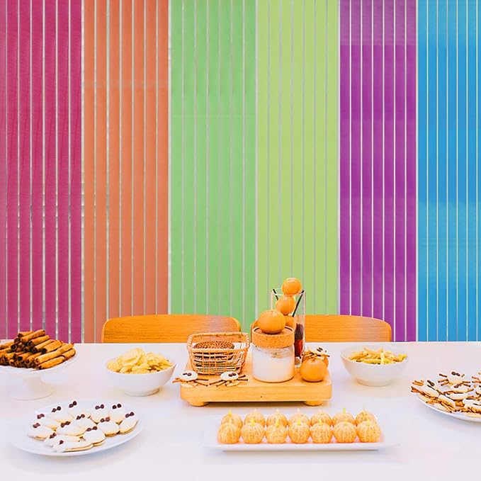 • Ideal Size and Bright Colors: Package contains 6 rolls of large sized crepe paper streamers in 6 colors of green, orange, yellow, pink,blue,purple.They are Neon Colors under normal light, but glow under black light. 600 feet/Each roll measures approx. 1.6 inches in width and 100 ft in length. Ideal Size for neon Party supplies.