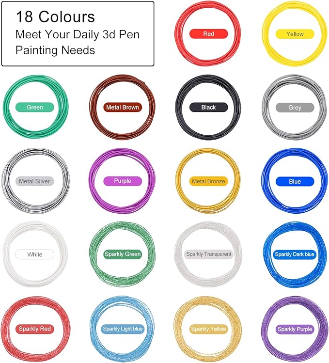 • Shining 18 Colors: This 1.75mm PLA 3d pen filament refills include 7 sparkly transparent color filament refills, 3 metallic color filament refills, 8 solid color filament refills. This muti color filament is an excellent gift for enthusiasts of 3D printing pen. Color list: red, yellow, green, metal brown, black, grey, metal silver, purple, metal bronze, blue, white, sparkly green, sparkly Transparent, sparkly Dark blue, sparkly red, sparkly light blue, sparkly yellow, sparkly purple,