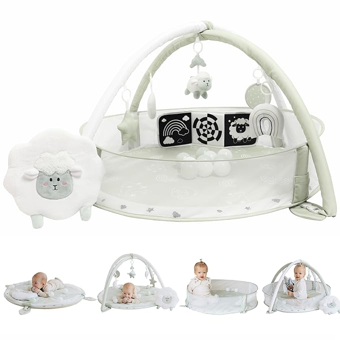 • 👼 {Adaptable} This versatile baby playmat encompasses 6 different uses: tummy time mat, baby activity center, pop up mesh fence, high contrast book, ball pit with balls included and lamb storage bag. Engineered to align with your baby's developmental stages, this mat will capture your baby's attention providing hours of both entertainment and learning. Caution: Always ensure adult supervision during use.