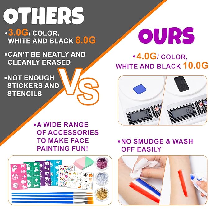 • EASY TO USE AND WASH OFF - The high-quality formula ensures that vibrant colors easy to apply and won't fade or smudge. When the fun is over, the washable face paint effortlessly comes off with mild soap and water or wet wipes.
