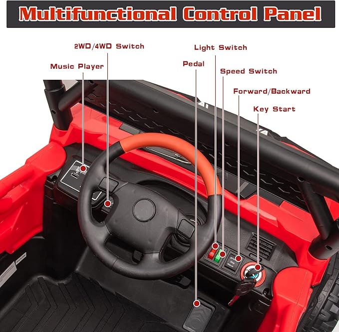 • REALISTIC DRIVING EXPERIENCE- This kids ride on truck has key start design, bright LED lights, horn &engine sounds, adjustable seat belt, lockable doors, foot pedal acceleration, wear-resistant wheels and cool decoration for off-road style, which can attract your kids at first sight