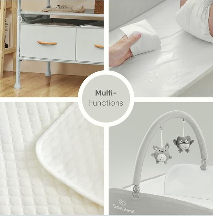 • HEIGHT ADJUSTMENT & MOBILE--The BabyBond baby changing table has upgraded 3 heights adjustment ranging from 33 inches to 35 inches, accommodating adults ranging from 4.8-6 feet tall, eliminating the need to bend or kneel during diaper changes. In addition, the portable changing table has four removable universal wheels with safety locks, making it easily movable from one room to another