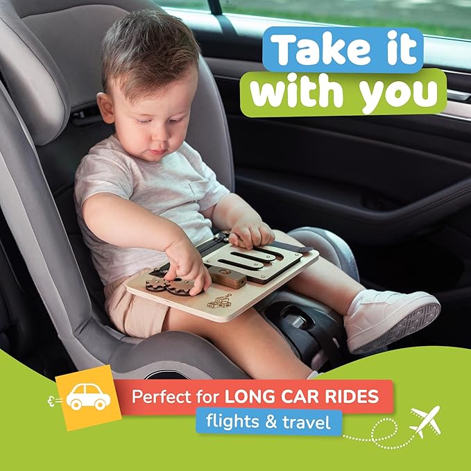 • Montessori Busy Board for 1 Year Old – Our sensory board for toddlers features engaging activities that enhance fine motor skills, problem-solving, and cognitive growth. Designed as an educational toy, it helps kids practice essential life skills. Lightweight and travel-friendly, this toddler busy board is perfect for screen-free play at home or on the go.