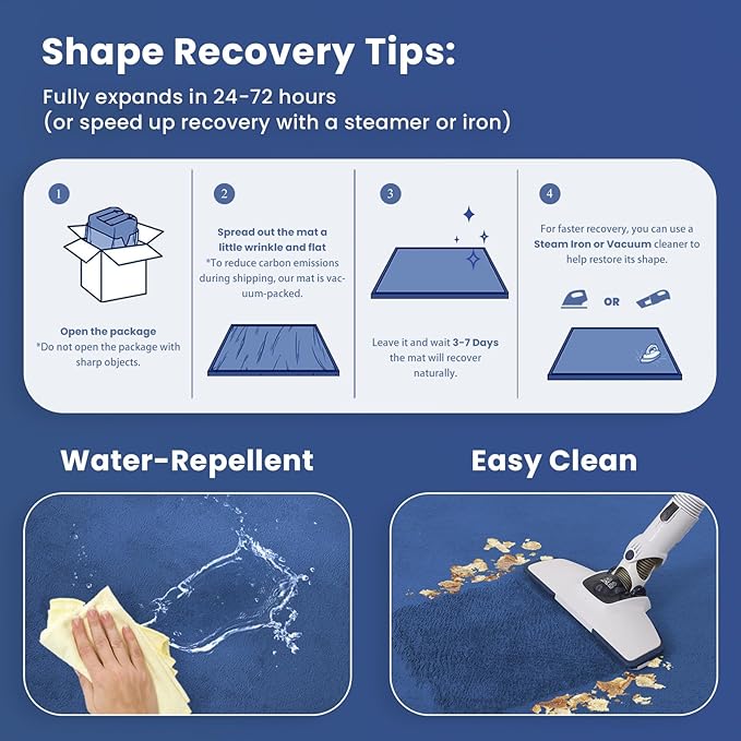• Tips: When you first received the mat, there may be a situation that it has not fully rebounded, the length and thickness may not have returned to the original state. We recommend that you use an iron or wait 3-5 days, your Relax Mat should be ready to use! Don't worry if it's a little smaller than it's meant to be, it will continue to fully expand and puff up, the mat will Restore to the original state