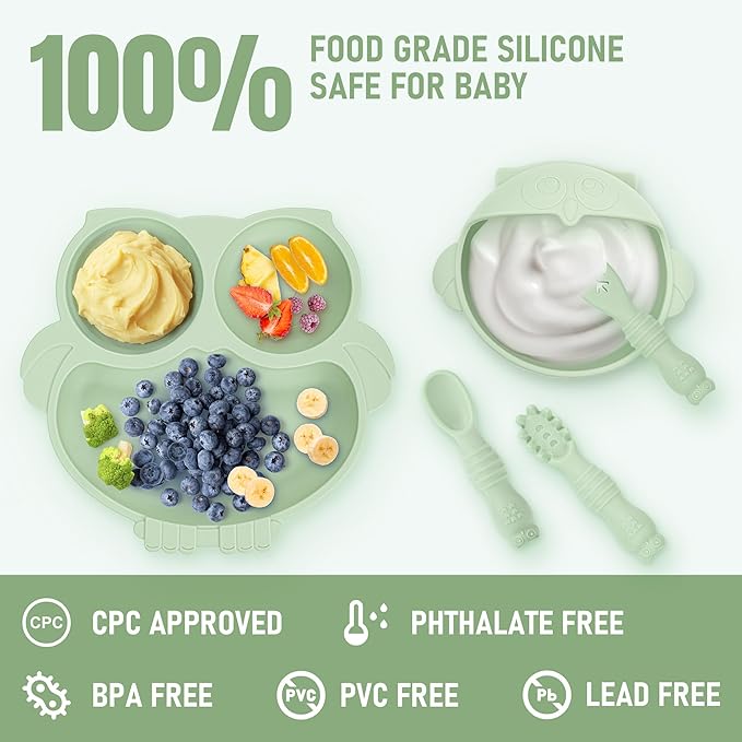 • Food Grade Safety Silicone Weaning Set: The baby weaning set is made of food grade silicone material, which is free of BPA, PVC, phthalates, and other harmful chemicals. The safe and healthy silicone feeding set not only provides convenience for the baby to train for self feeding, but also the soft and safe silicone material will not affect the baby's growing teeth. It is the most ideal choice for baby weaning.