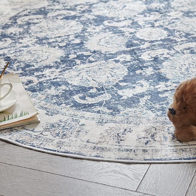 jinchan Round Rug 6ft Area Rugs Vintage Floral Distressed Design - Machine Washable Non-Slip Low-Pile Ultra-Thin Circle Rug for Entryway Bedside Living Room Dining Room Bedroom (6' Round,Dark Blue)