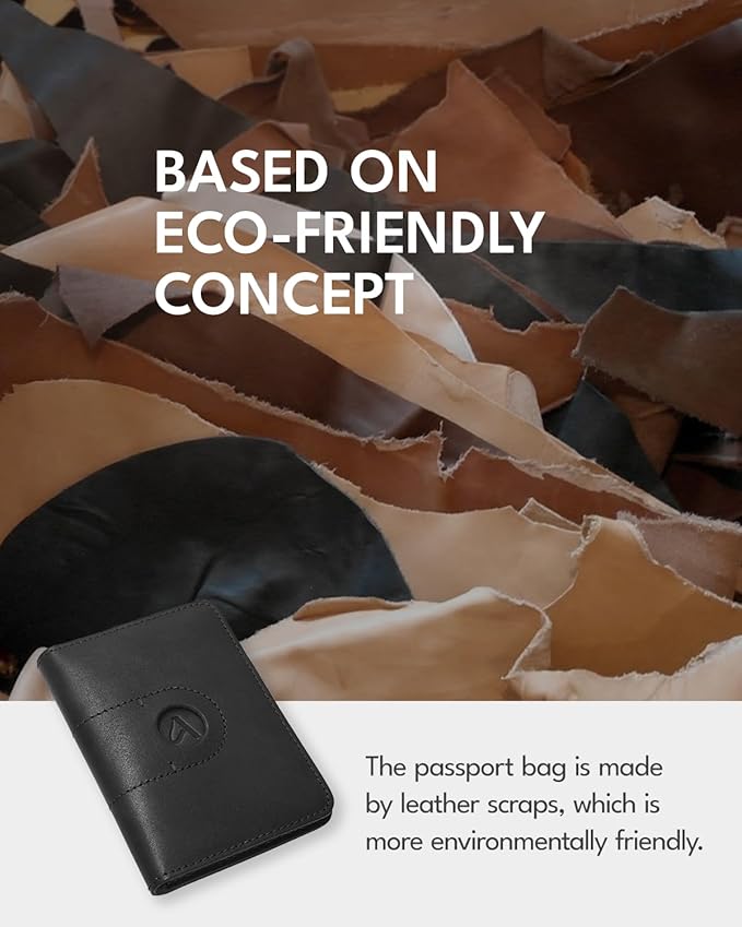 • Genuine leather passport holder:It is made from leather scraps.Making it an eco-friendlier choice. The high-quality full grain cattle leather material gives the wallet a sophisticated and luxurious feel, with durability, fine texture, soft and touch