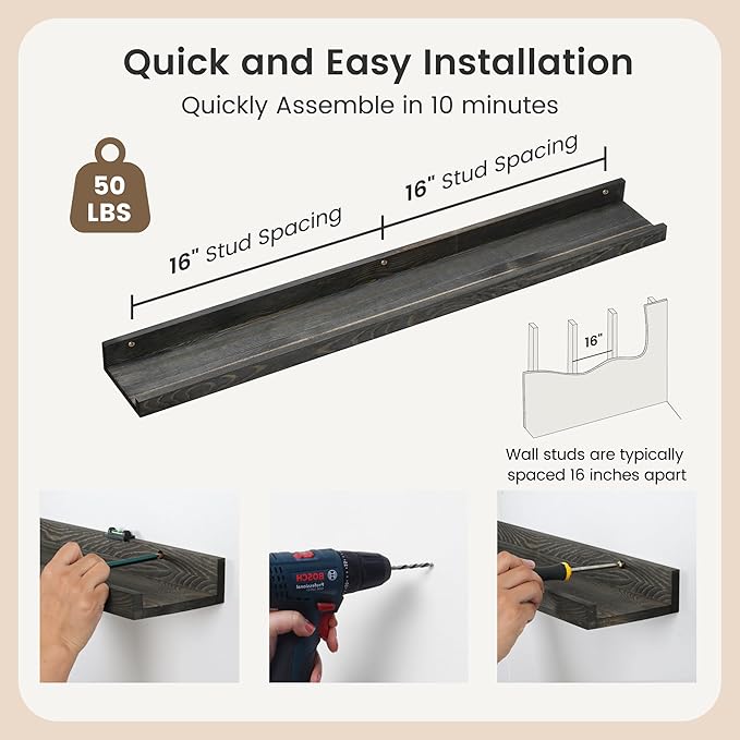 • Easy to Install: You will get a level, screws for the wall, drywall anchors, a detailed installation guide, and two beautiful hand-crafted solid pine wood shelves. With the level, you can make sure your picture ledge shelves are well aligned. Just follow the simple instruction to install the hanging shelves for wall decor within 10 minutes. We add additional screw and anchor to the hardware bag just in case. If you have any questions about our products, please feel free to contact us