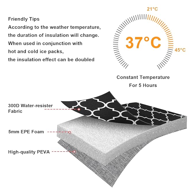 • Material : High quality water-resistant 300D composite oxford fabric, 8mm extra-thick EPE foam, Food-grade PEVA